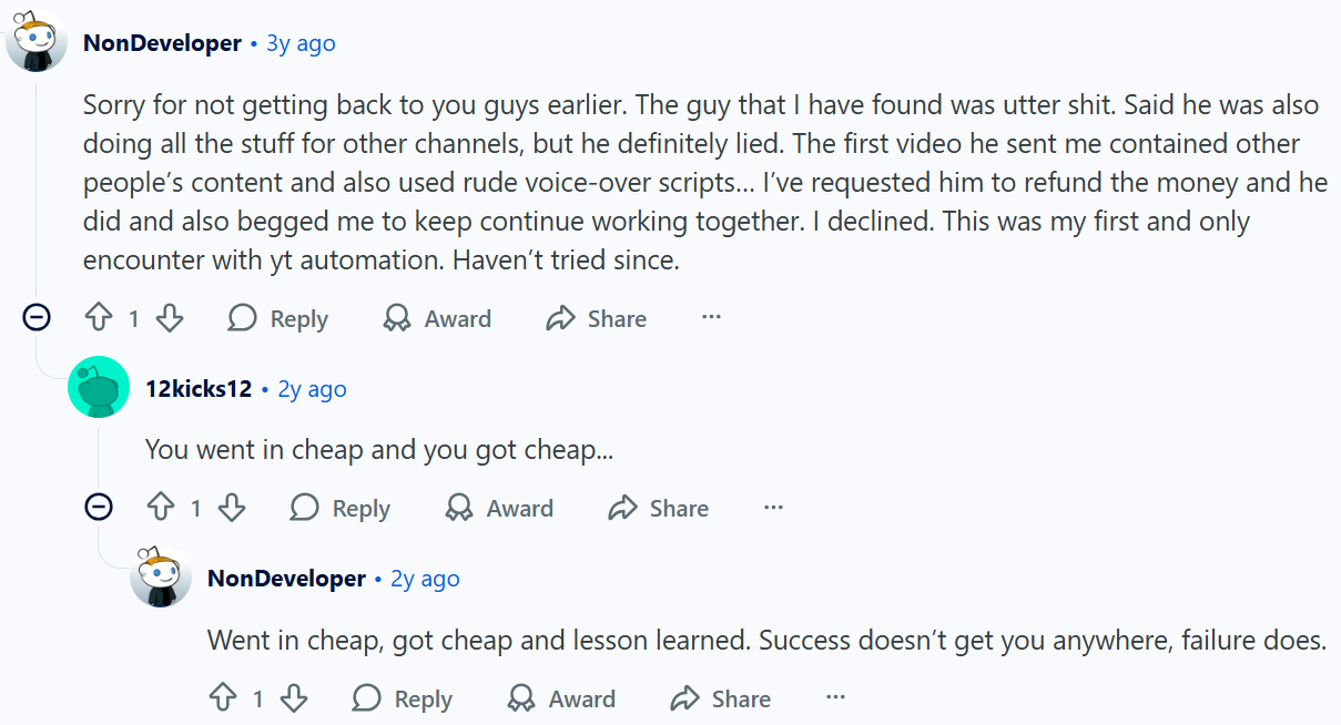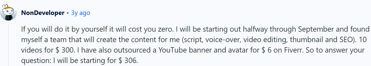The experience of Reddit user NonDeveloper shows what happens when you try to start YouTube automation with a low budget. They were eager to hire YouTube automation help from Fiverr for just $300 for 10 videos.