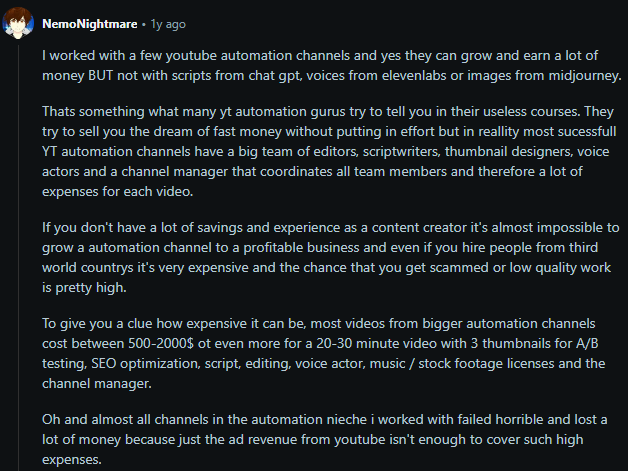 One Reddit user who has worked on YouTube automation channels emphasizes the considerable cost required to run these channels successfully. They mention bigger automation channels typically spend $500-$2,000 per video at least. As such, access to capital is often the limiting factor when trying to scale YouTube automation.