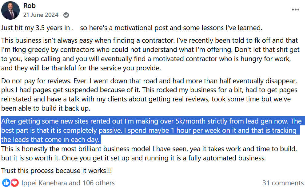 Here is one of the students from my private group talking about how they are making over $5K/month in passive income from the local lead generation business model.