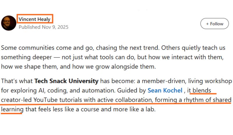 Tech Snack PRO reviews are positive but sparse. The only reviews I found were a couple of LinkedIn posts. The reviewers liked the collaborative and engaging community. They like the support and motivational push that Sean provides. I found no complaints about the program.